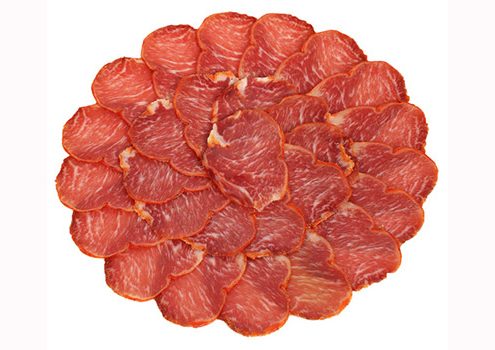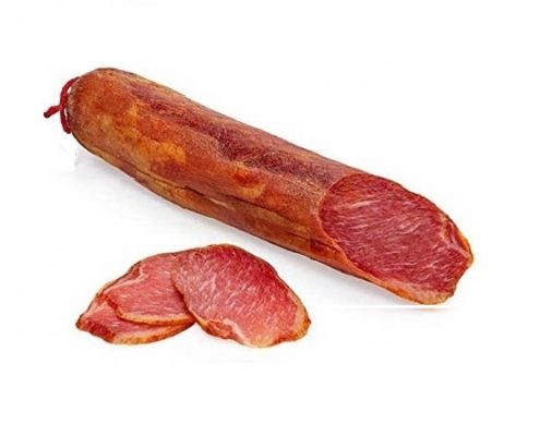 Caña de Lomo de cerdo Ibérico. Adobada con sal marina, pimentón de la Vera, ajo y orégano. Embutida en tripa natural o artificial, en su fase de curación pasará por una campana de madera donde arde muy lentamente carbón de encina para darle su aroma y sabor característico, posteriormente permanecerá en secaderos naturales un mínimo de 3 meses.