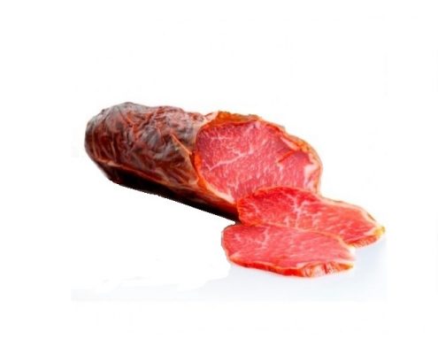 Presa de cerdo Ibérico. Adobada con sal marina, pimentón de la Vera, ajo y orégano. Embutida en tripa natural o artificial, en su fase de curación pasará por una campana de madera donde arde muy lentamente carbón de encina para darle su aroma y sabor característico, posteriormente permanecerá en secaderos naturales un mínimo de 3 meses.